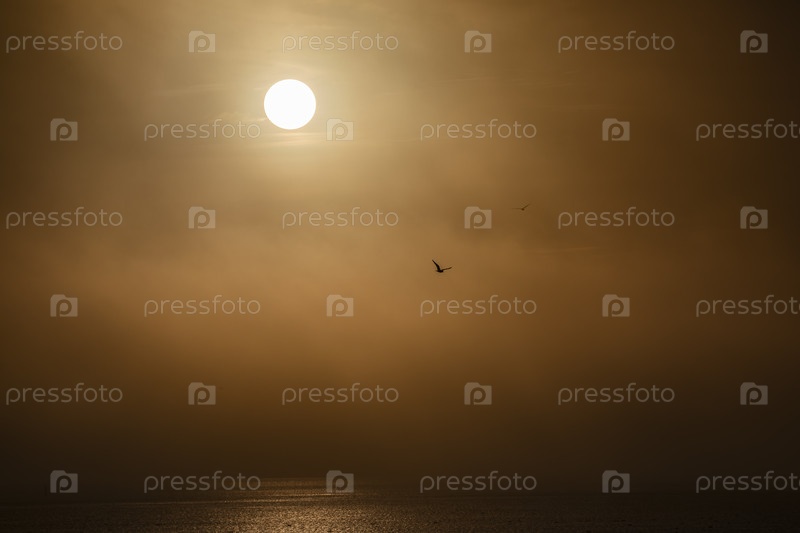 Яркий морской закат с солнцем птицей в небе