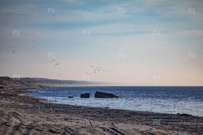 Пустынный песчаный пляж на берегу спокойного синего моря