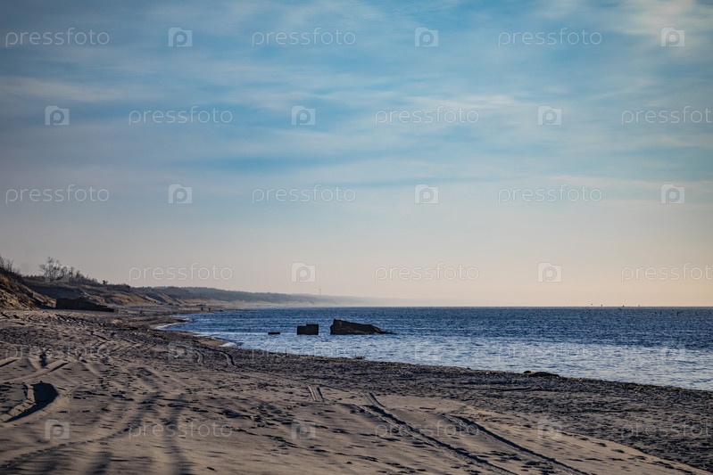 Пустынный песчаный пляж на берегу спокойного синего моря