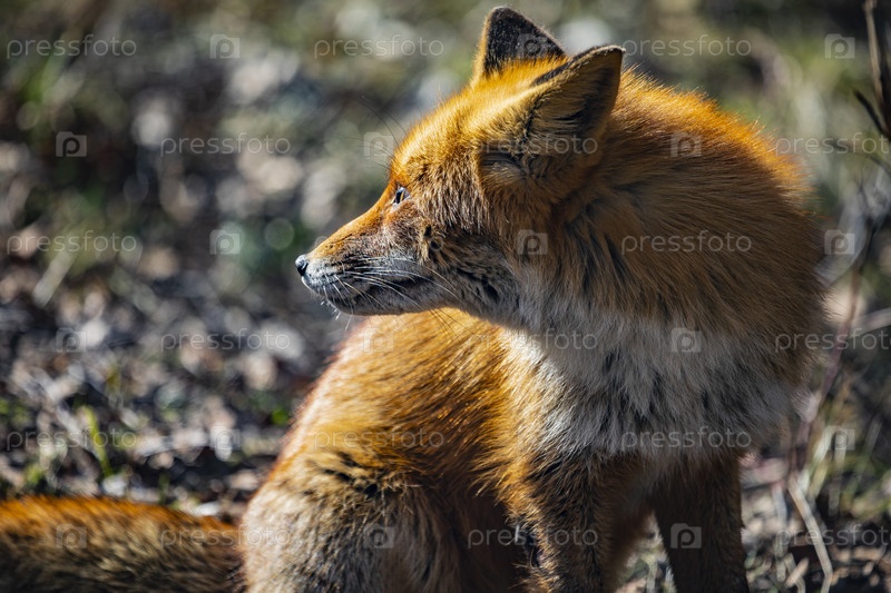Одинокая рыжая лисица в лесу утром весной