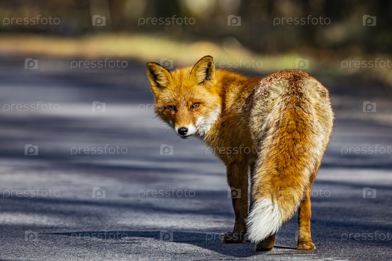 Одинокая рыжая лисица на лесной дороге утром весной