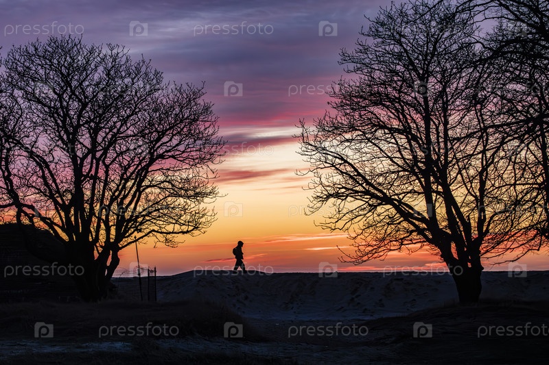 Силуэт фотографа между голыми деревьями на берегу моря на ярком закате