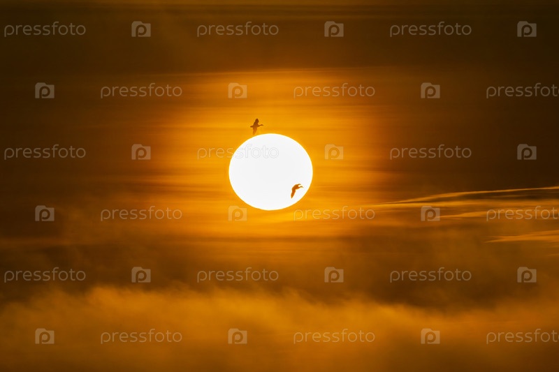 Яркий морской закат с солнцем птицей в небе