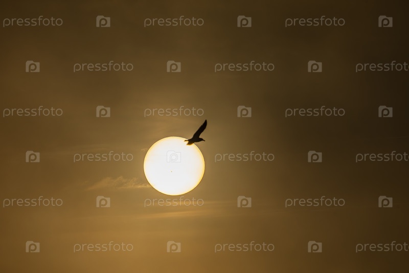 Яркий морской закат с солнцем птицей в небе