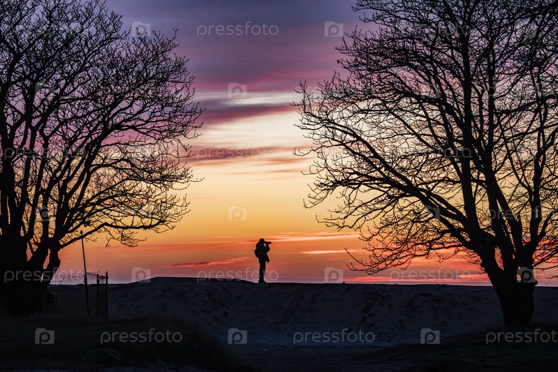 Силуэт фотографа между голыми деревьями на берегу моря на ярком закате