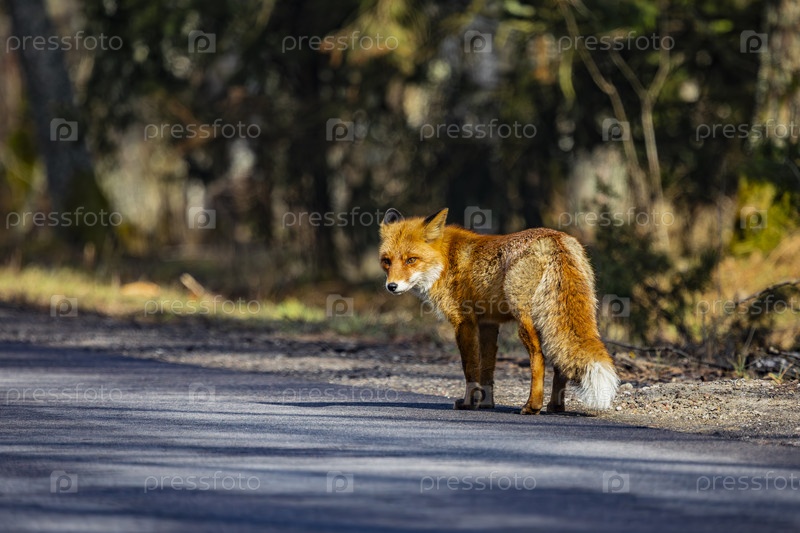 Одинокая рыжая лисица на лесной дороге утром весной