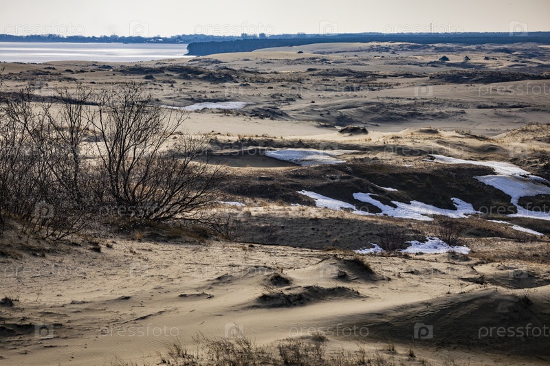 Зимний пейзаж песчаных дюн на Куршской косе у замерзшего морского побережья