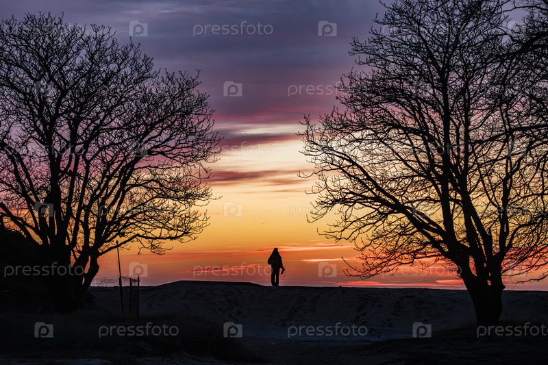 Силуэт фотографа между голыми деревьями на берегу моря на ярком закате