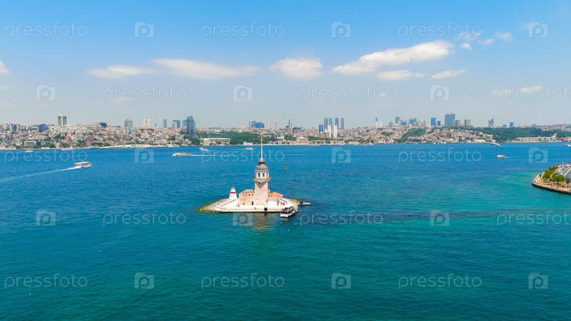 Европейский берег Босфорского пролива с пассажирскими паромными лодками и водными такси, плавающими в ясный солнечный день
