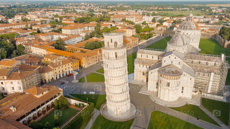 Пиза, Италия. Знаменитая наклонная башня и пизанский собор в Пьяцце деи Мираколи. Лето. Утренние часы, вид с воздуха