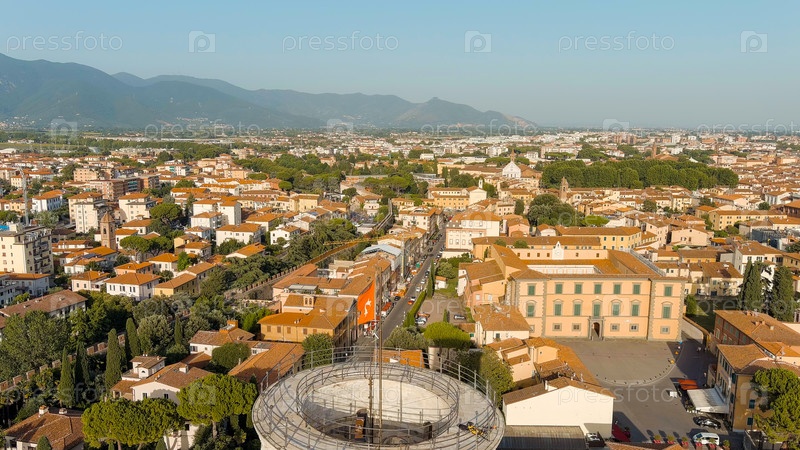 Пиза, Италия. знаменитая наклонная башня и пизанский собор в Пьяцце-дей-Мираколи. лето. вечерние часы, воздушный вид