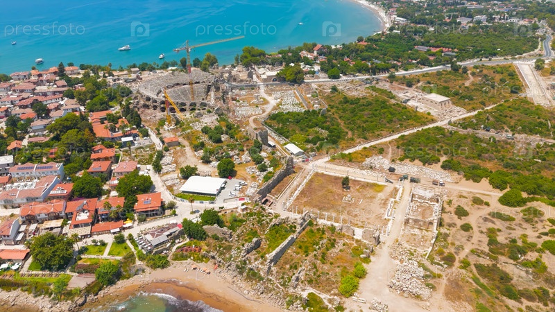 Сид, Манавгат, Турция.Древняя Агора и римский амфитеатр с краном, Храм Тихе, колоннированная улица, пляж на археологическом участке в солнечный день