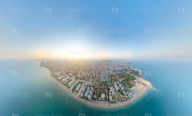 Мерсин, Турция. захватывающая широкая панорама прибрежного района Мезитли на закате солнца. многоквартирные дома с бассейнами, песчаными пляжами, прогулкой и горами, исчезающими в теплом тумане. вид из воздуха