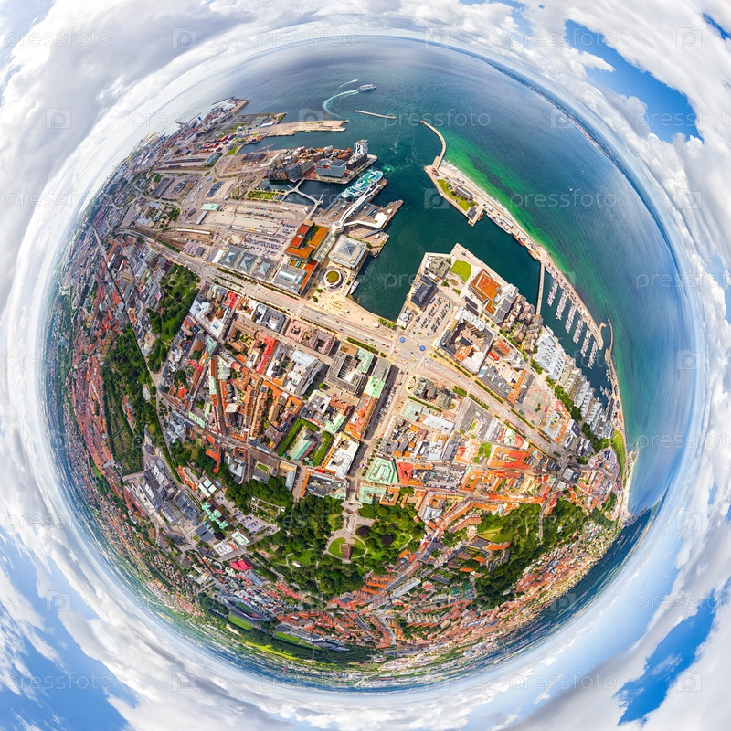 Хельсингборг, Швеция. Панорама города летом с портовой инфраструктурой. Оресунский пролив. Днем. 360-градусный панорамный астероид