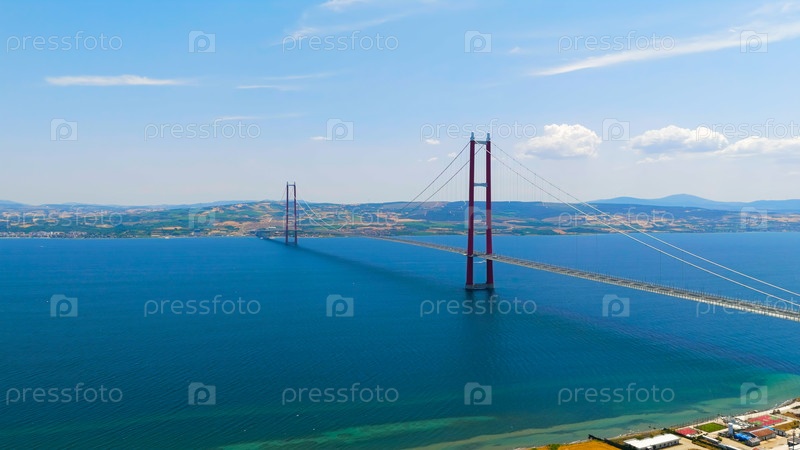 1915 Canakkale Bridge Aerial View on Sunny Day, Drone Shot of World's Longest Suspension Bridge Over Dardanelles Strait.Взгляд с воздуха