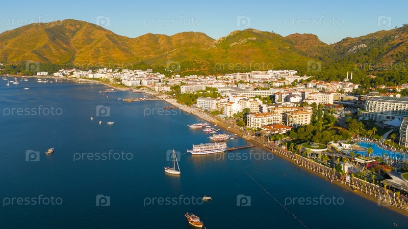 Мармарис, Турция. судно для отдыха на пирсе с прибрежными кафе и отелями в мягком утреннем свете. прогулка, пустой пляж и нежные волны, безмятежная атмосфера.. Aerial View