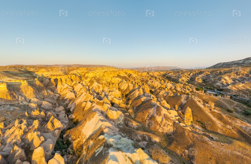 Goreme, Nevsehir, Турция. широкий панорамный вид с беспилотного летательного аппарата на Долину Деврента (Долина воображения) при закате солнца. странные скальные образования, напоминающие животных, волшебные дымоходы и камни в форме верблюда. Вид из возд