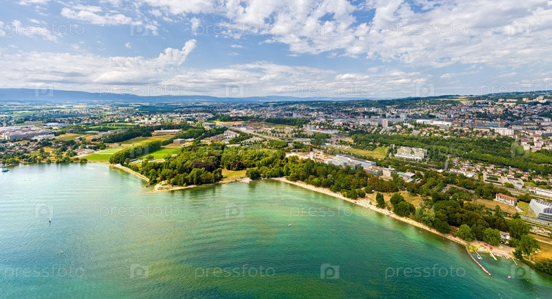 Лозанна, Швейцария. набережная озера и панорама города летом. вид с воздуха