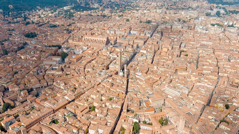 Болонья, Италия. Старый город. Две башни. (Le due Torri) Гарисенда и Делли Асинелли. Башни 12-го века. Лето, взгляд с воздуха