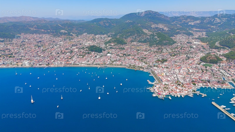 Панорамный вид на городскую бухту с многочисленными яхтами и парусниками из воздушного дрона. Живая береговая линия в яркий летний день.. Aerial View