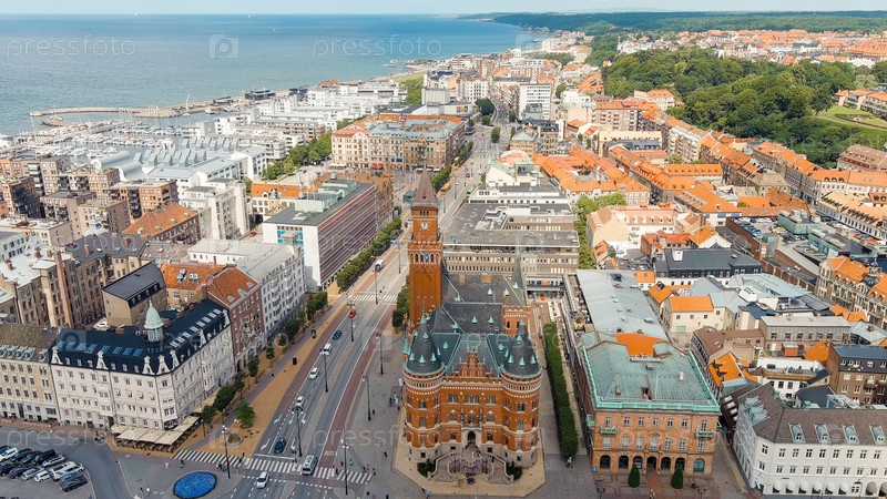 Хельсингборг, Швеция. Городская ратуша Хельсингборга. Летний день. Облачная погода, Aerial View