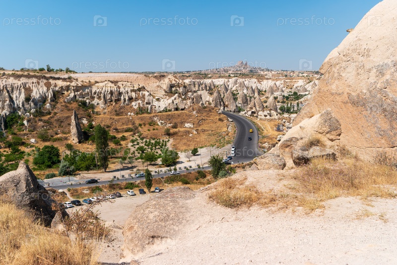 Горэме, Невшехир, Турция. живописный вид на сказочные дымоходы, извилистые асфальтированные дороги с припаркованными автомобилями, редкая растительность и замок Учисар в отдалении под чистым голубым небом
