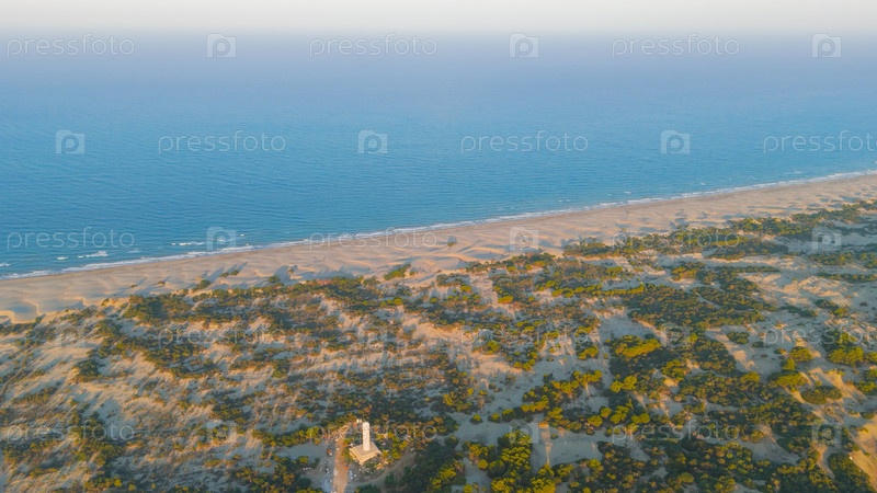 Вид с воздуха золотых песчаных дюн и голубых волн Средиземного моря на пляже Патара, летнее утро с длинными тенями