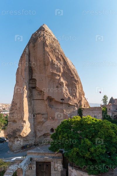 Большое эрозированное коническое скальное образование с вырезанными жилищными особенностями, каменный путь, ограниченный зеленью, традиционные здания и воздушные шары под чистым небом