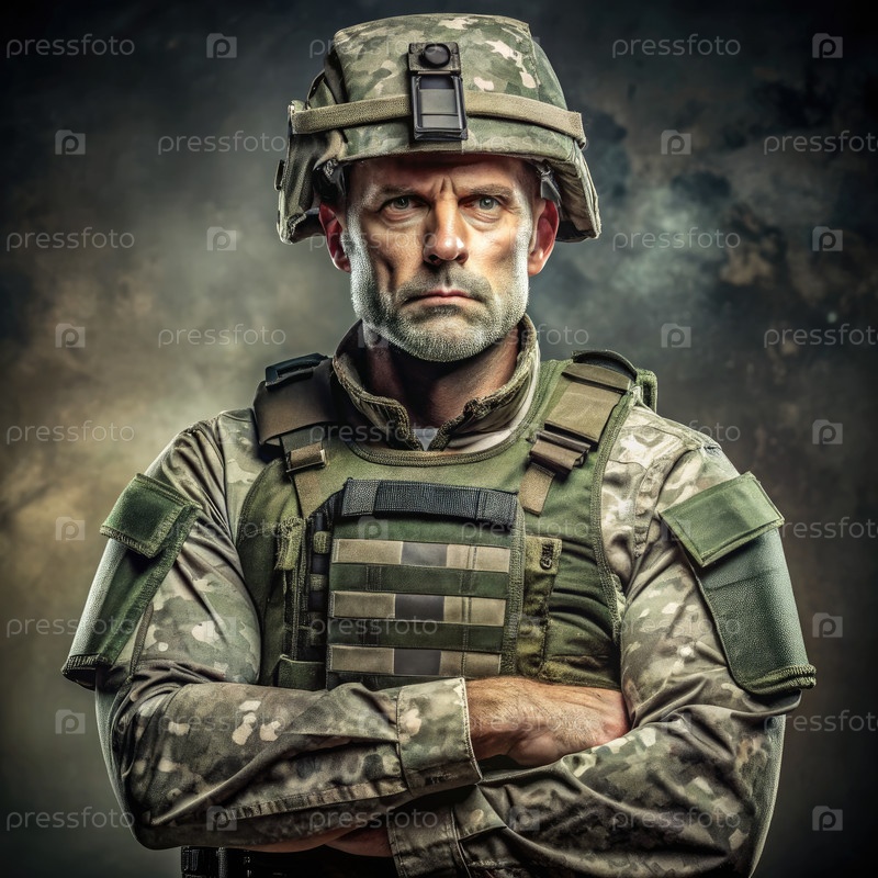 Военный командир в пуленепробиваемом жилете уверенно стоит на учебном объекте