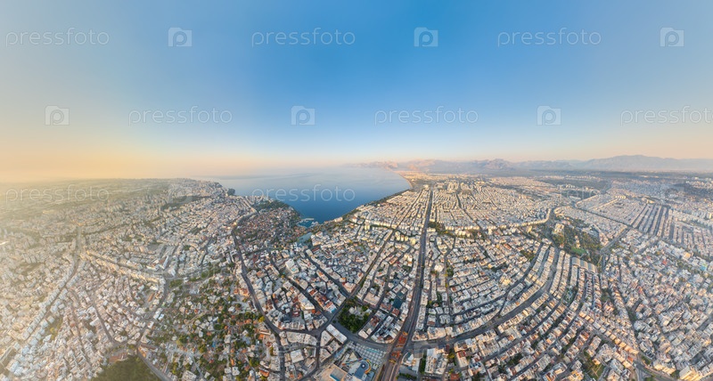 Панорама с воздуха, иллюстрирующая географические отношения между городским поселением, его сетью улиц, парками отдыха и прилегающим Средиземным морем