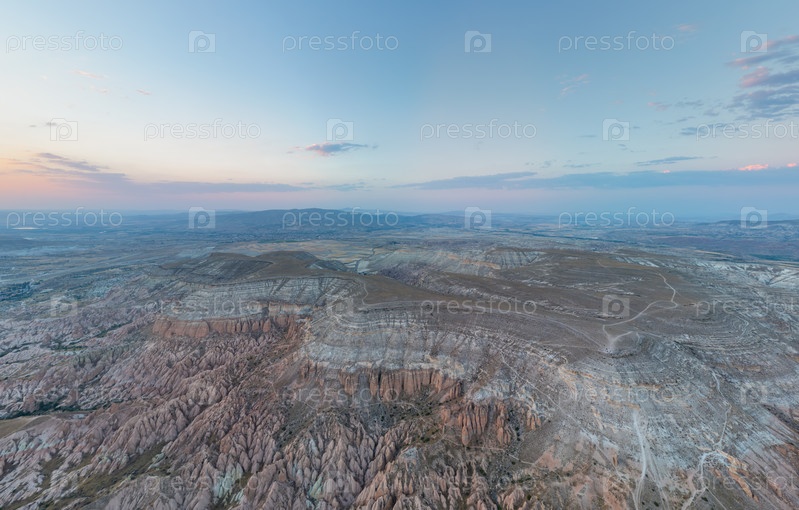 Гореме, Невшехир, Турция.Панорама из воздуха слойного плато Каппадокии с розово-красными склонами и эрозированными образованиями, раскрывающими миллионы лет вулканической истории.Вид с воздуха