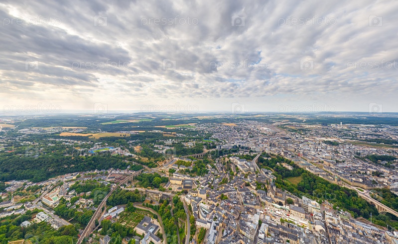 Люксембургский город, Люксембург. Панорама города. Летний день, облачная погода. Вид с воздуха