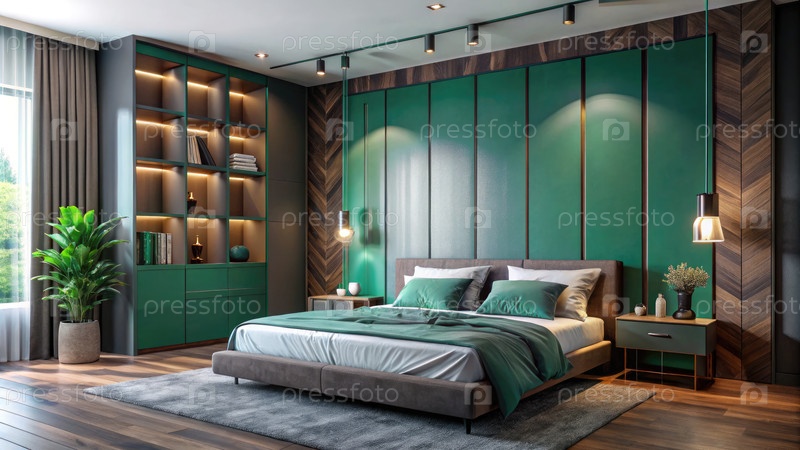 Современный дизайн спальни, демонстрирующий стильную стену almirah с яркими зелеными акцентами
