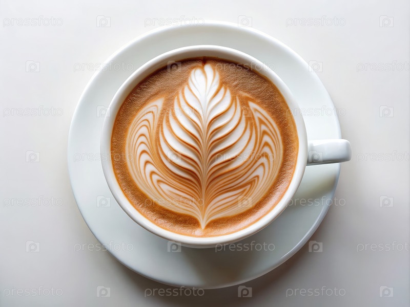 Красиво выполненная кофеварка с латте-арт, выставленная на белом столе