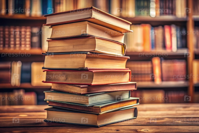 Куча книг на деревянном столе в уютной библиотеке