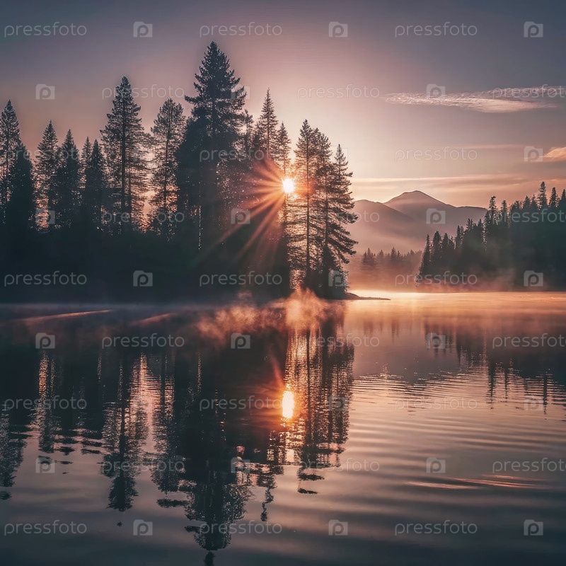 Спокойный закат над спокойным озером, окруженным высокими вечнозелеными деревьями