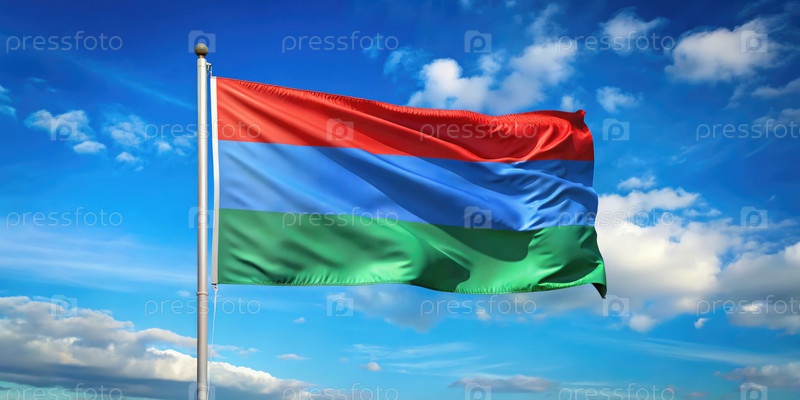 Флаг Карелии размахивает против чистого синего неба с пушистыми белыми облаками