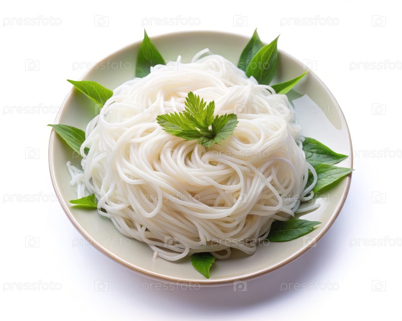 Красиво устроенные чистые тайские лапши из рисовой муки на тарелке со свежими травами