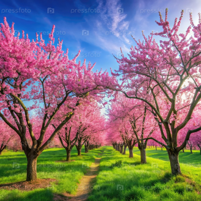 Красивые цветущие вишневые деревья выстраивают мирный путь весной