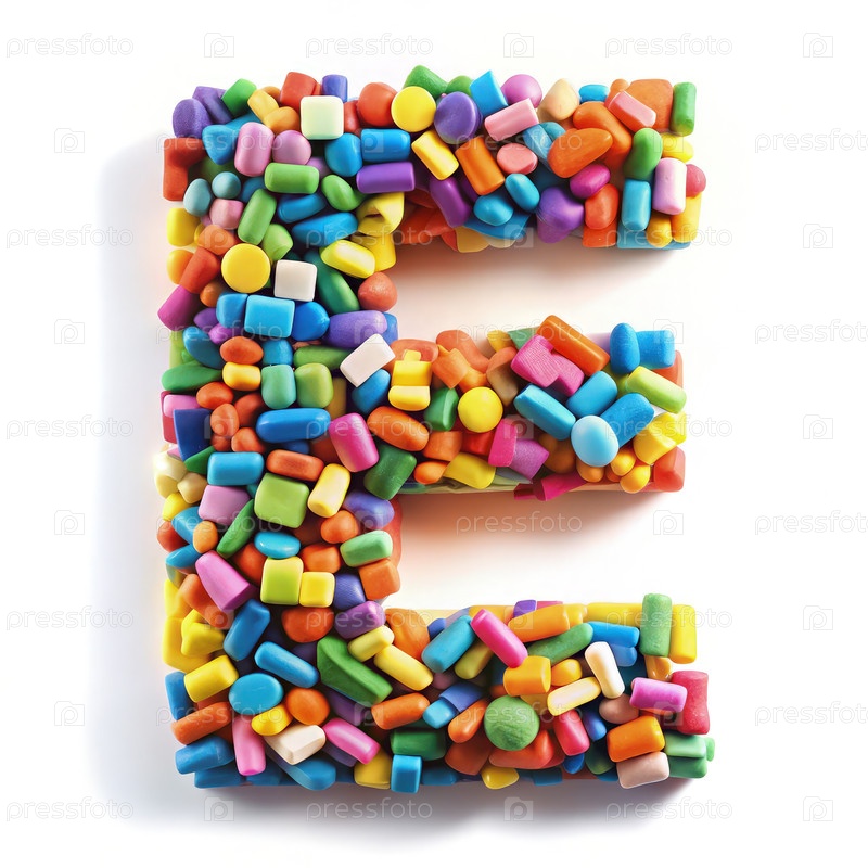 Красочная буква E заполнена яркими жевательными конфетами на белом фоне