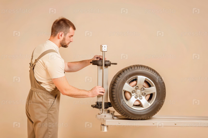 Техник выполняет выравнивание колес на транспортном средстве с высокоточным оборудованием