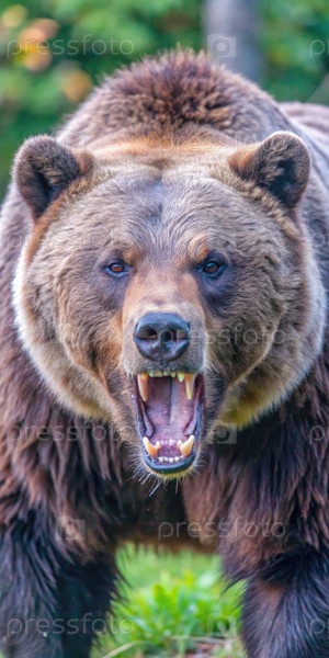 Разгневанный медведь демонстрирует яростное выражение лица в пышном лесу на рассвете