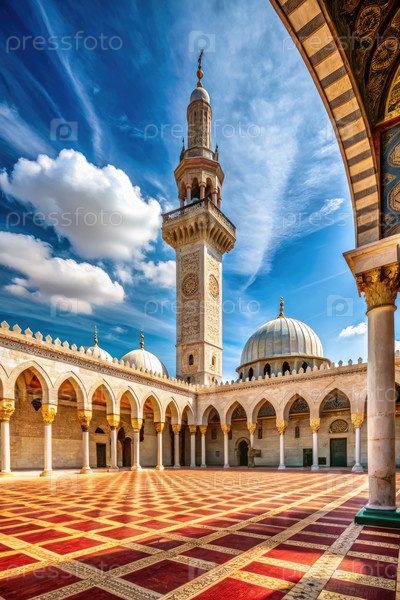 Вид на алтарь мечети под ясным небом в Мечети Омейядов в Rz. Generative AI