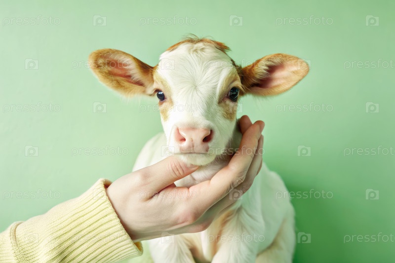 Нежный момент с очаровательным теляткой на мягком зеленом фоне