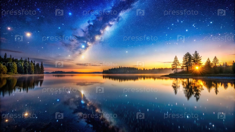 Спокойное ночное небо, наполненное звездами над спокойным озером в сумерках