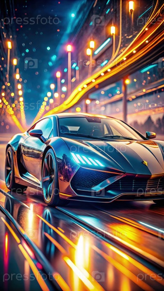 Футуристическая светящаяся машина, крусирующая по оживленной дороге ночью