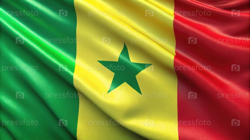 Яркий национальный флаг Сенегала, размахивающий ветром на ярком фоне
