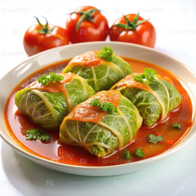 Наполненные капустовые рулоны из савойского соуса, подаваемые с свежими помидорами и травами