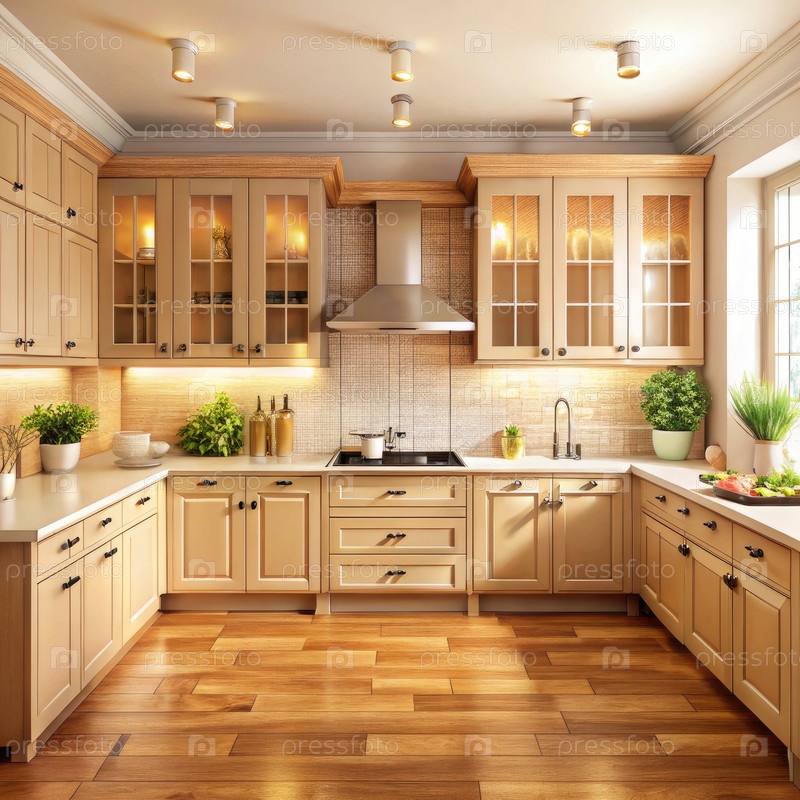 Современная кухня с деревянными шкафами и сковородкой на плите в полдень