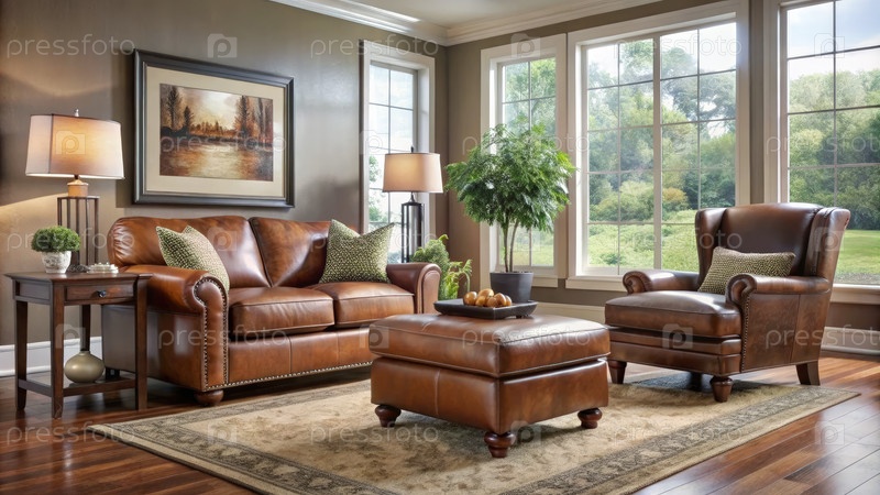 Элегантное коричневое кресло и османский стол в хорошо освещенной комнате для дизайна интерьера